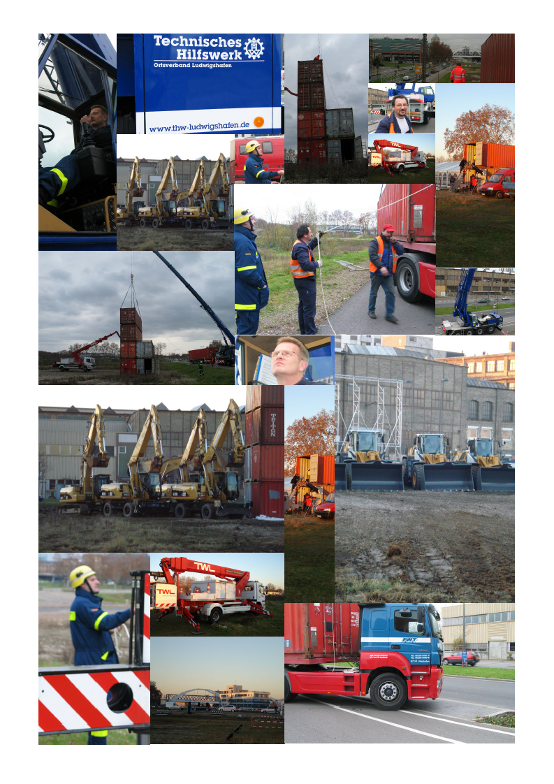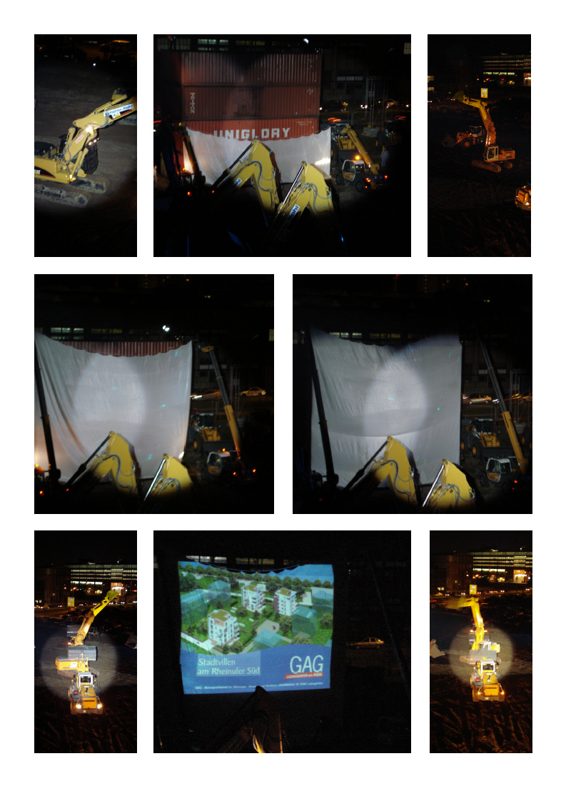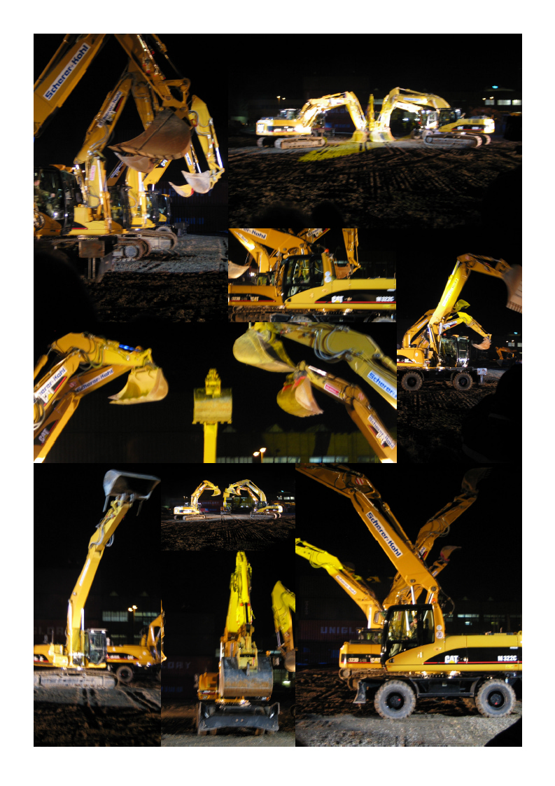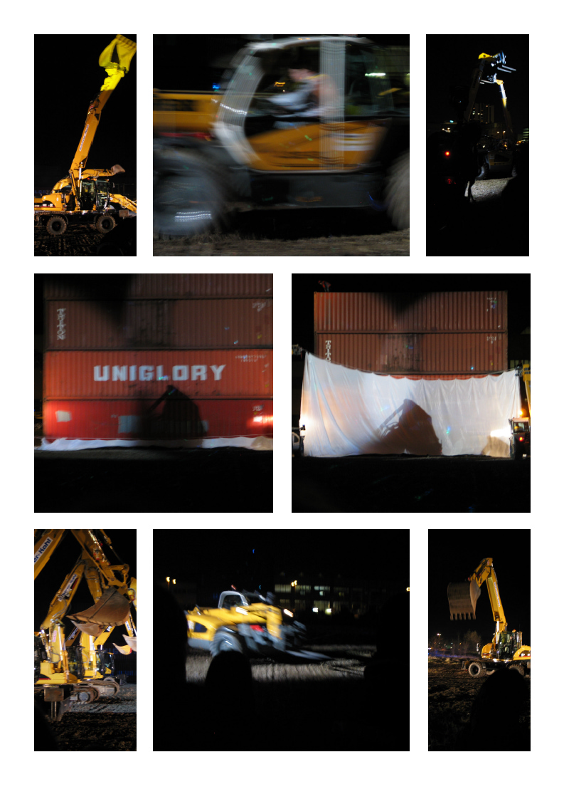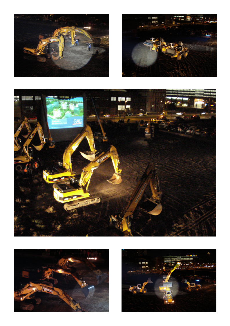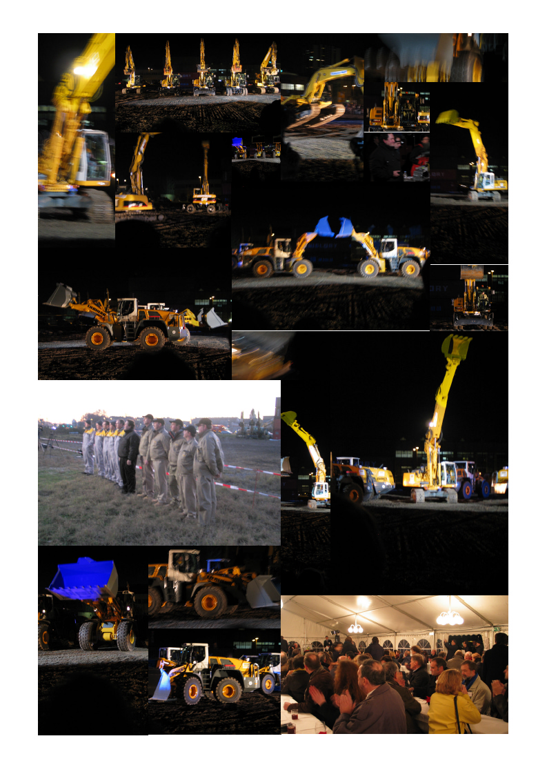 »Erdbewegung - Himmelwärts« Ein Ballett für 12 Baumaschinen. Anlässlich des Baubeginns des neuen Stadtteils Rheinufer Süd tanzten am 15.12.06 Vier Radlader, drei Raupebagger, drei Mobilbagger und zwei Teleskopstapler auf einem 50 x 50 m großen Areal in Ludwigshafen am Rhein. Als Kulisse diente eine eigens aufgebaute 10 m hohe Containerwand, die zum Ende des Balletts mit einem 15 x 13 m großen Tuch verhüllt wurde. Nachdem das Tuch von 4 Industriekletterern befestigt worden war projizierte ein 14.000 Ansilumen starker Videobeamer eine Architekturanimation des zukünftigen Stadtteils auf die so entstandene Leinwand. Als Höhepunkt der Performance vollzogen die Oberbürgermeisterin von Ludwigshafen und Präsidentin der Metropolregion Rhein-Neckar Frau Dr. Eva Lohse mit dem Baudezerneten Ernst Merkel und dem Vorstand des Investors Detlef Tuttlies einen synchron Spatenstich mit je einem 40 Tonnen schweren Hydraulikbagger. Das Projekt war anschließend Hauptthema der Sendung Landsart im SWR Fernsehen, schaffte es in die SWR Landesschau und auf die Titelseite der Rheinpfalz. Lichtgestaltung Rainer Grönhagen, Lasershow Laserperformance Gerold Römer, Erlangen. Im Auftrag der GAG-Ludwigshafen und mit freundlicher Unterschützung von Liebherr Mietpartner GmbH, Ludwigshafen, Liebherr Holding AG, Biberach Riss, Zeppelin Baumaschinen AG München und Frankthal, Triport Ludwigshafen, FWT Containerspedition GmbH & Co., Neuhofen, TWL und THW Ludwigshafen sowie Scherer und Kohl Recycling GmbH in Ludwigshafen. Hier finden Sie einen Pressetext. Hier sehen Sie einige Bilder. Aufbau, Seite1,Seite2,Seite3, Seite4, Finale | |