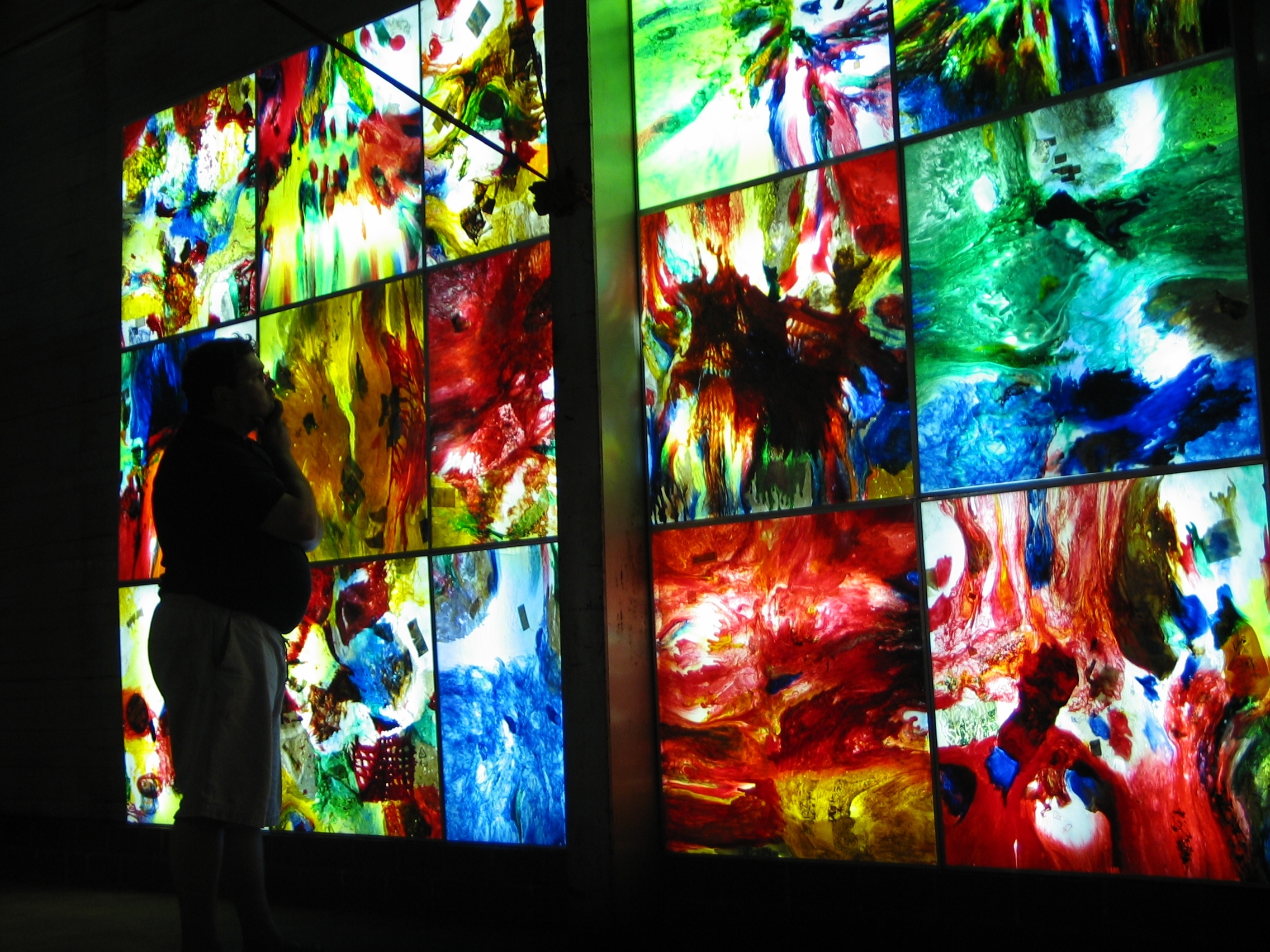 Kurator Samuel J. Fleiner vor der Leuchtwand von Bär und Knell